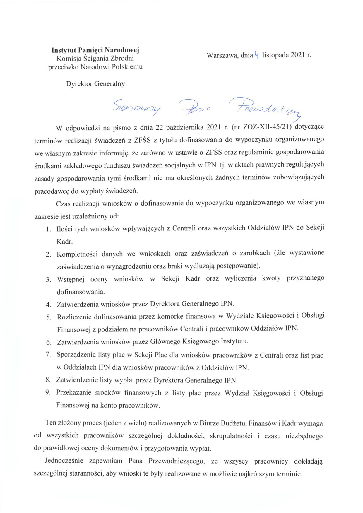 Równocześnie zachęcamy do zapoznania się z treścią pisma, które otrzymaliśmy od pracodawcy, w którym tłumaczy zasady wypłat środków z ZFŚS. Szczególnie wart uwagi jest pierwszy akapit, w którym pracodawca zauważa, iż w tym zakresie nie wiążą go żadne terminy. Trudno nie odnieść wrażenia, iż jest to swego rodzaju krok w tył w porównaniu z wcześniejszymi zapewnieniami, w szczególności z uzasadnieniem do zmian w Regulaminie ZFŚS, w którym zaznaczono, iż zaproponowane zmiany są potrzebne m. in. dlatego, aby uprościć i przyspieszyć wypłatę także „grusz”, z czym nasza ZOZ zgadza się w 100%, co potwierdziliśmy podpisem Przewodniczącego KZ pod proponowanymi zmianami (z wyłączeniem spornego paragrafu zwiększającego do 14 ilość dni kalendarzowych urlopu wymaganych, aby wystąpić o „gruszę”).