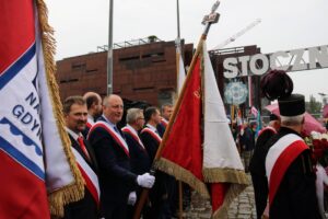 Kwiaty przy historycznej Bramie nr 2 Stoczni Gdańskiej złożyła również delegacja „Solidarności” Regionu Mazowsze (do której należy i nasz związek), na czele z Przewodniczącym Dariuszem Paczuskim.
