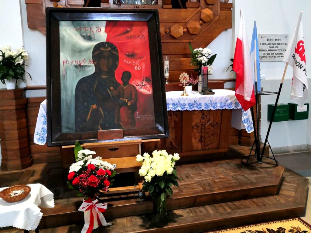 W świątyni wystawione zostały symbole związane z historią naszego związku: relikwie bł. ks. Jerzego Popiełuszki, obraz „Matki Bożej Robotników Solidarności” i replika Krzyża Nowohuckiego. Od września br. peregrynują one po parafiach archidiecezji białostockiej.